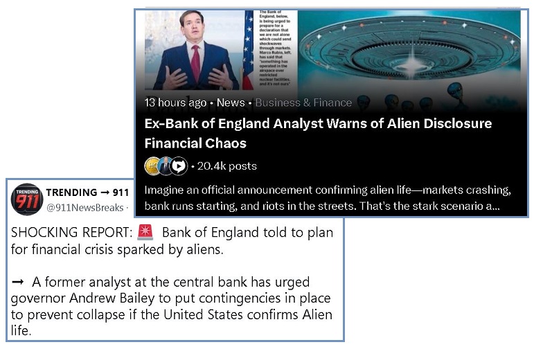 Bank of England must Plan for Financial Crisis Sparked by Aliens January 16, 2026 https://www.thetimes.com/uk/scotland/article/bank-of-england-must-prepare-for-ufo-announcement-f3mh8l9vh The Bank of England must plan for a financial crisis being triggered by an official announcement confirming the existence of alien life, one of its former policy experts has claimed. A declaration of that magnitude would send shockwaves through the markets and could trigger bank collapses and civil unrest. [and from another] Seriously— is US about to announce alien life??? Emergency meeting in UK to prepare for possible market collapse https://www.godlikeproductions.com/forum1/message6127722/pg1 [and from another] UFO Whistleblower Claims Trump was 'Fully Briefed' on Alien Hybrids Living Among Humans December 8, 2025 https://www.dailymail.co.uk/sciencetech/article-15363981/UFO-whistleblower-Donald-Trump-evidence-non-human-intelligence.html In a recent interview, whistleblower and retired US Air Force Major David Grusch claimed that Trump has received reports on crashed spacecraft and non-human remains retrieved by the US, the origins of these beings, and their intentions. Grusch, a current advisor to Congress's UAP Task Force, said the president could soon become the 'most consequential leader in world history' by publicly disclosing what America has kept hidden about extraterrestrials. [and from another] Trump to Announce 'Most Important Revelation in Human History' on 79th Anniversary of Roswell UFO Crash January 16, 2026 https://www.ibtimes.co.uk/trump-announce-most-important-revelation-human-history-79th-anniversary-roswell-ufo-crash-1771539 British documentary maker Mark Christopher Lee claims Donald Trump has already written a speech confirming alien contact that will be delivered during the 2026 World Cup.