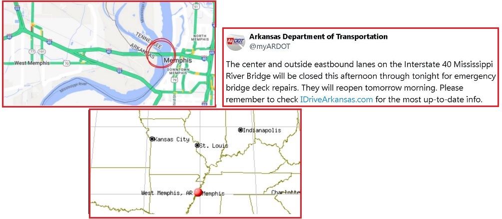 - Центральная и внешняя полосы движения на мосту I-40 через реку Миссисипи будут закрыты с сегодняшнего дня до вечера в связи с экстренным ремонтом настила моста. Они откроются завтра утром. «Большая дыра в центральной полосе. Похоже, можно проехать насквозь. Затем на большом мосту в центральной полосе обнаруживается ещё одна большая дыра, в которой осталась только арматура